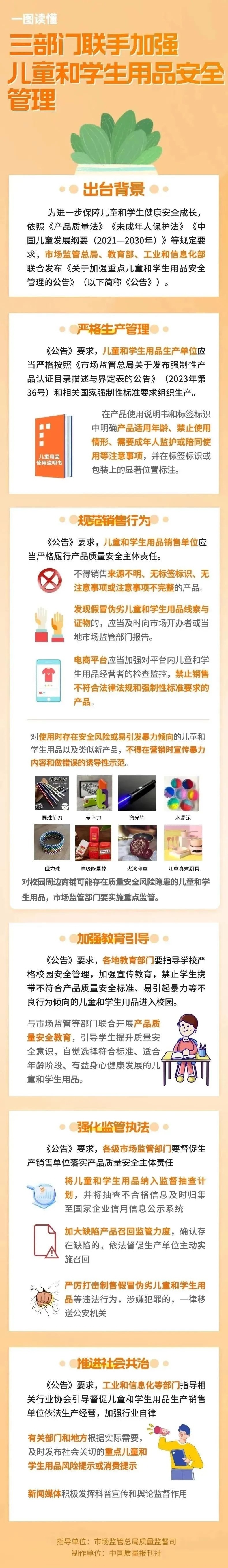 近日,市场监管总局、教育部、工业和信息化部就加强重点儿童和学生用品安全管理有关事项发布公告。具体怎么做?教育君带你一起了解——